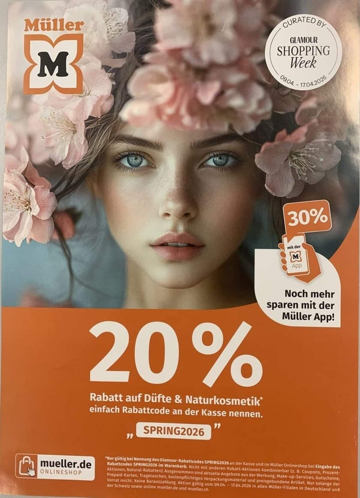 20% Rabatt auf Düfte & Naturkosmetik bei Müller mit dem Rabattcode „SPRING2026“. Einfach an der Kasse nennen.